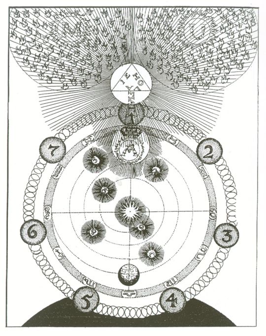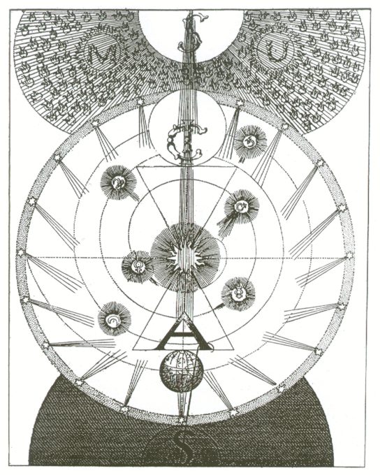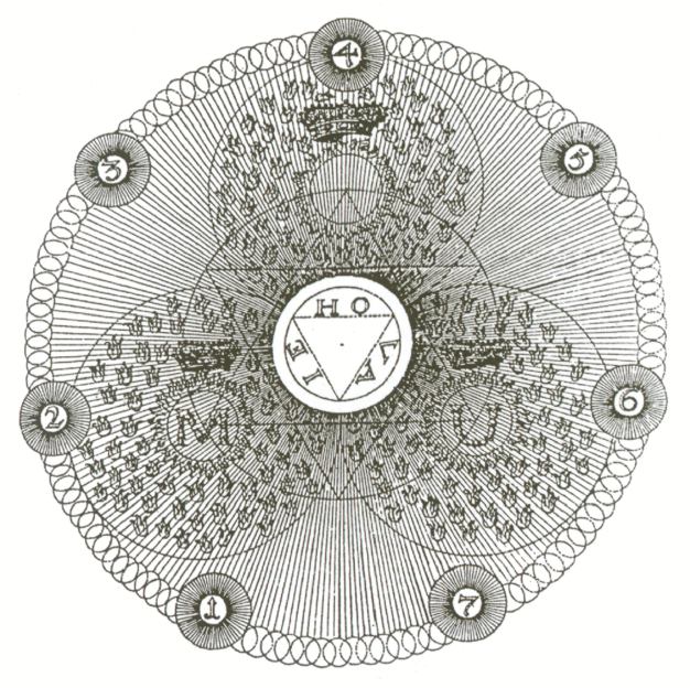 | Notate in questa antica illustrazione, presa da "Heroglyphica Sacra" del 1764, di Dionysius Andreas Freher, che era un seguage di Jakob Bohme [entrambi mistici Cristiani], e che si trova anche nel libro di Roob : la 'A' è stata cancellata dalla sfera superiore. | ![]() |